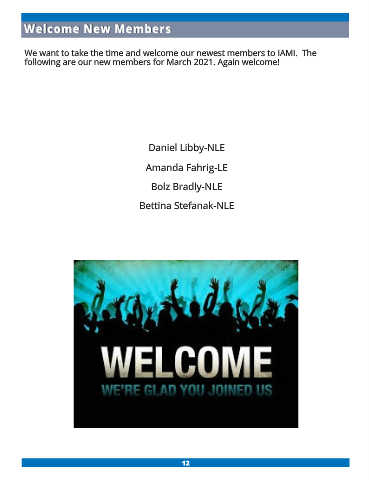We want to take the time and welcome our newest members to IAMI. The following are our new members for March 2021. Again welcome! Daniel Libby-NLE Amanda Fahrig-LE Bolz Bradly-NLE Bettina Stefanak-NLE 12