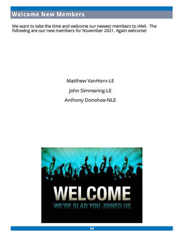 We want to take the time and welcome our newest members to IAMI. The following are our new members for November 2021. Again welcome! Matthew VanHorn-LE John Simmering-LE Anthony Donohoe-NLE 11