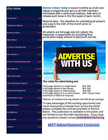 Marine Crimes Today is issued monthly as a full-color